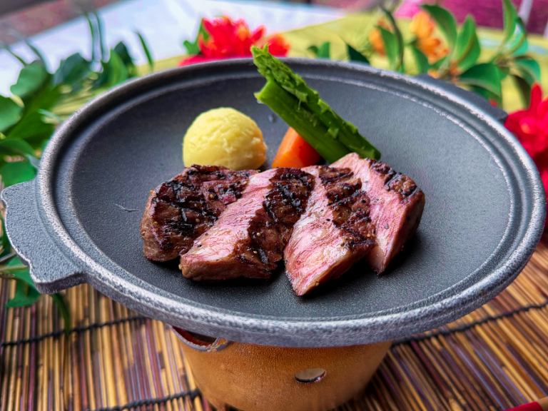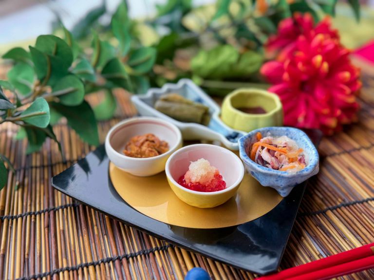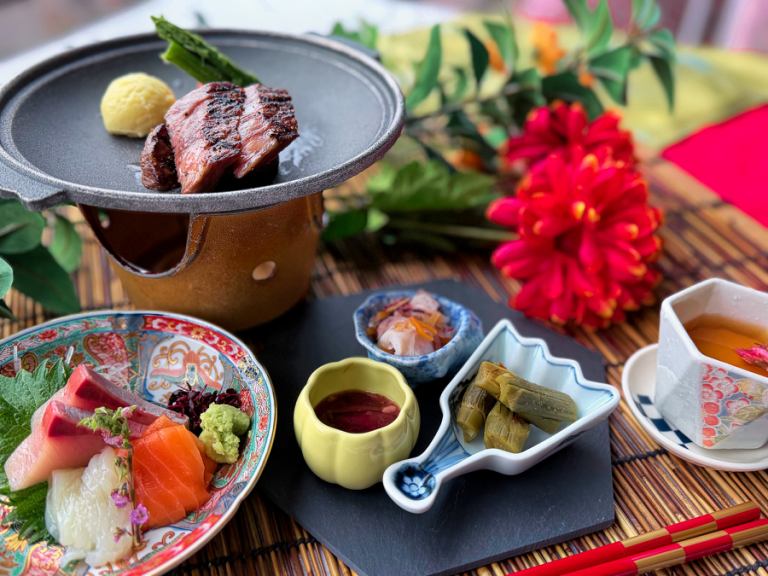 Enjoy a luxurious selection of seasonal flavors, including domestic beef sirloin grilled on a ceramic plate, a five-kind assortment of seasonal fish sashimi, five kinds of appetizers, and grilled silver mackerel with sansho pepper.